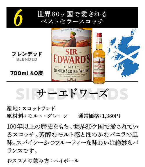 商品名 サーエドワーズ 原産国・生産国/生産地 スコットランド 容量(ml) 700ml アルコール度数 40%