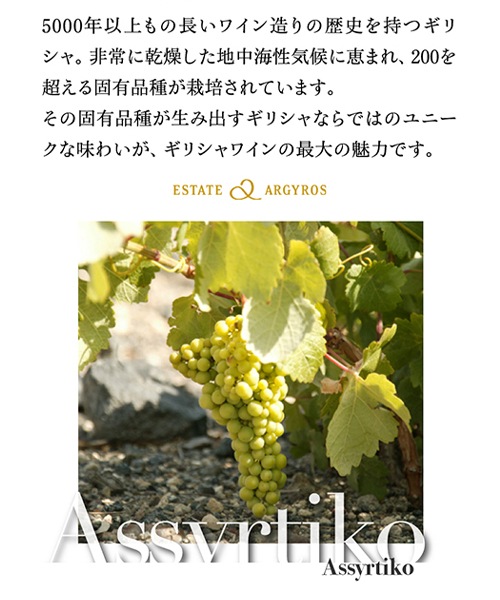 このアトランティスホワイトはアシルティコ品種が主体になっています。果実味と酸のバランスを取るためにアイダニとアシリがブレンドされています。英字表記 ATLANTIS WHITE ARGYROS 生産者 エステート アルギロス タイプ・味わい 白/辛口 葡萄品種 アシルティコ、アシリ、アイダニ 内容量(ml) 750ml